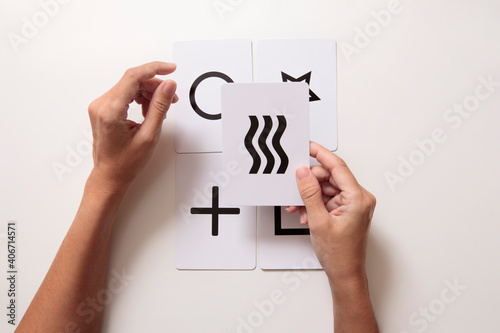 Manos de mujer cogiendo una carta Zener con olas. Vista desde arriba. Fondo blanco.
