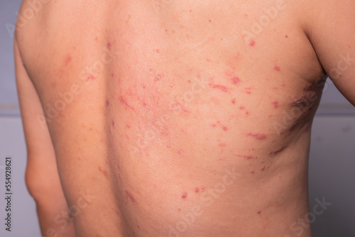 man's back was covered with many red wounds. insect allergy full back rash skin disease