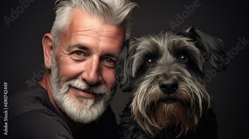 Man's best friend: older Schnauzer purebred dog and his owner, companions for life. Portrait showing timeless bond and great loyal friendship.