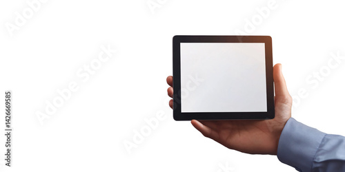 Mans hand holding a blank screen tablet device on a transparent background Concept of digital technology, communication, and mobile app design