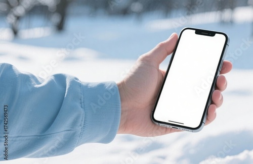 phone, smartphone, modern, white, blue, man, winter, closeup, snow, hold, holding, sweater, pastel, screen, case, copy space, background, beautiful, banner, technology, digital, colours, blank, display, device, business, showing