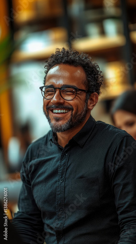 happiness, achievement, business, man, corporate, expression, confidence, warmth, office, professional, adult, executive, indoor, beard, open, curly, employee, human, meeting, positive, eye, male, intelligence, company, teeth, black, laughter, hair, portrait, shirt, engagement, success, conversation, work, cheerful, face, enthusiasm, photogenic, presentation, businessman, emotion, person, friendly, atmosphere, leadership, teamwork, communication, joy, goggles