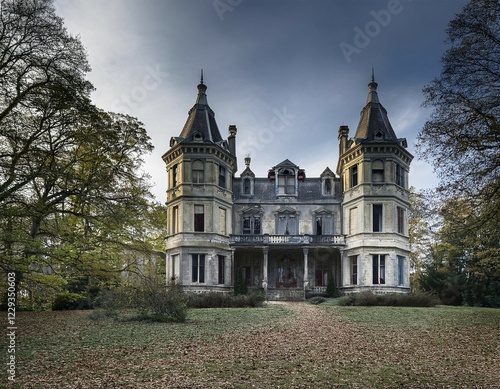 Mansion with turrets, set against an overcast sky, surrounded by autumn-colored trees and a sprawling lawn, AI generated