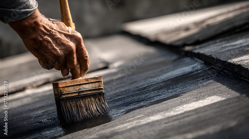 surface, barrier, old, shadow, roofing, gritty, slate, texture, up, layer, maintenance, repair, coating, detail, sunlight, groundwork, men at work, liquid, construction, wooden, natural, moisture, protection, stone, weathered, improvement, bristle, wet, beautiful, exterior, application, dark, material, grip, handle, labor, hand, sealing, renovation, rough, craft, process, close, brush, absorption, coarse, industry
