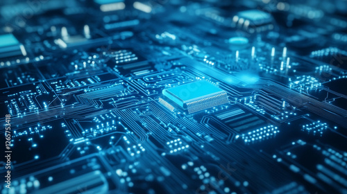 Manufacturing Automation. Advanced High Precision Close-up of a futuristic blue circuit board with glowing lines and components,