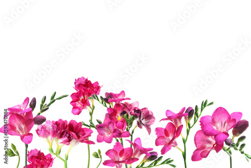 Many beautiful freesia flowers on white background