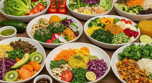Many bowls of colorful salads with various ingredients on a light background.