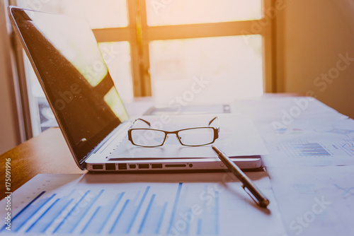 Many charts and glasses. Reviewing data. Financial reports and glasses. Reflection background.