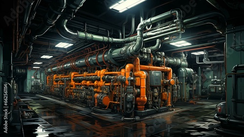 Many iron pipes and pipelines with valves and chemical industrial equipment in the workshop at the factory