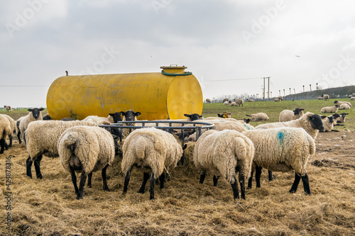copy space, straw, rubbish, circular, england, english, britain, outdoors, domestic animals, nourishment, country, field, farm animal, farming, landscape, herd, background, lamb, meadow, wool, domestic, pasture, grazing, farmland, grass, alert, nervous, ewe, farm animal, stock, food, eat, mud, muddy, graze, breed, mammal