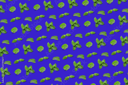 Many mint leaves on blue background. Pattern for design