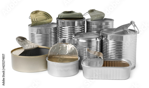 Many open tin cans isolated on white