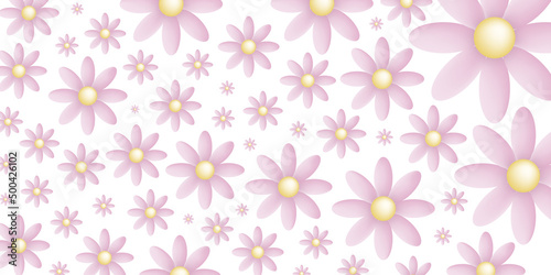 Many pink and yellow flowers on a white background