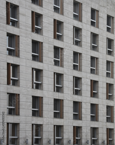 many rows of glass windows frames on large square grey concrete tiles wall of business office building. front view. gray tiled exterior. Belgrade Serbia City town centre .