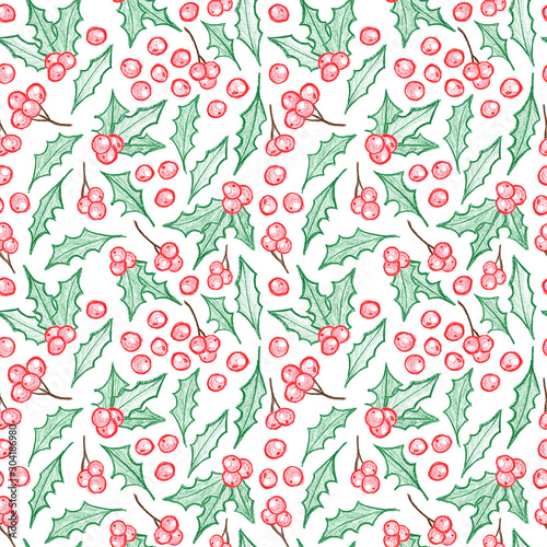 Many scattered green mistletoe branches and leaves with red berries on white background. Hand drawn seamless pattern. Colour pencils drawing. Floral pattern for Christmas, New Year theme design..