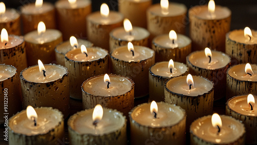 Many Small Burning Candles On A Wooden Surface Many Small Burning Candles