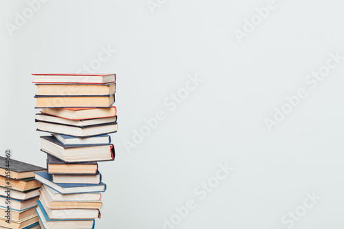 many stacks of educational books at home preparing for exams on a white background