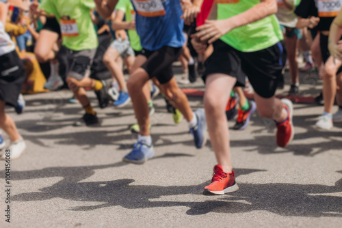 Marathon runners crowd, sportsmen participants start running the half-marathon in the city streets, crowd of sportswomen joggers in motion, group athletes outdoor training competition in a summer day