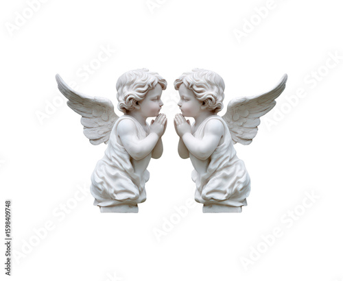 Marble angel sculptures: symmetrical child figures with wings in prayer on transparent background, PNG