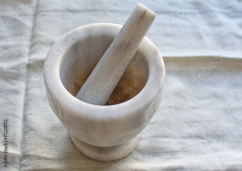 bowl, closeup, mashed, crusher, fabric, food, grated, isolated, kitchen, linen, marble, material, mill, mince, mortar, powder, smooth, tool, white