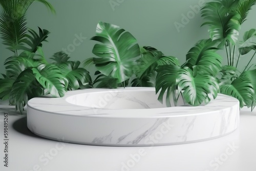 dais, platform, leaf, green, space, marble, design, colours, creative, illustration, cosmetic, abstract, light, tree branch, empty, beauty, modern, template, plant, sale, presentation, stage, floor, idea, concept, fresh, summer, show, three-dimensional, display, blank, scene, natural, object, white, composition, generative, ai