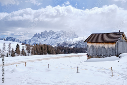 March 2025: winter landscape at Ski Area in Dolomites, Italy - Alpe Lusia. Ski resort in val di Fassa near Moena. Winter Dolomites and blue sky. Aerial view on ski slopes