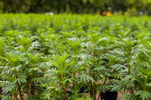 Marigold flower and growing plant in the gardening. Growth of yellow flowers and concept of gardening