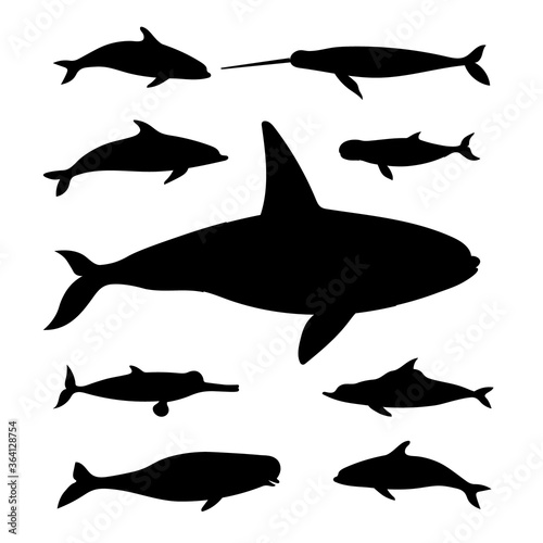 vector, illustration, hand-drawn, image, fauna, animal, silhouette, killer whale, narwhal, killer whale, marine mammal, set, collection, isolated, ocean life, black