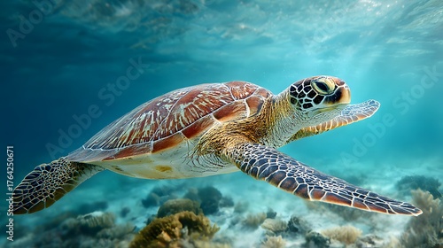 Marine reptile gracefully swims through sunlit tropical ocean water above coral formations