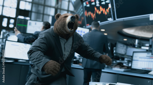 Market Bear's Roar: A metaphorical embodiment of financial caution roars in a bustling trading floor, representing the potential for market downturns.