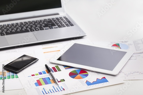 Market. Financial charts on the table with tablet phone and pen