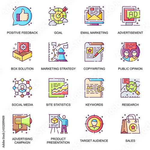 marketing, strategy, thin, line, outline, linear, lined, pictogram, flat, icon, icon, set, collection, pack, logotype, mobile, app, cartoon, vector, colours, development, positive, feedback, goal, electronic mail, telemarketing, advertisement, social, media, site, statistic, keyword, research, advertising, campaign, product, presentation, client, review, service, promotion, online, sale