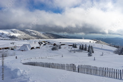 cloudy sky, snow, winter, skiing, slope, timberland, landscape, grove, weather, blizzard, pine, vegetation, tree branch, plant, wood, twig, person, freezing, outdoors, cold, man, land, trunk, hill, forest, standing, glacé, covered, riding, jacket, season, winter storm, jumping, sun, sunny, wind, sled, frost, ice, tree, nature, snowboard, snowboarding, snowshoe