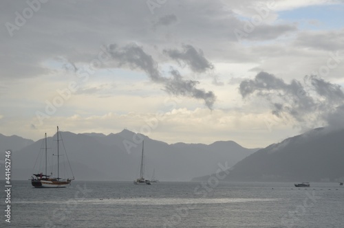 Marmaris, Turkey. Seascape of Aegean Bay Sea with yachts in raining day.