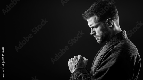fighter, karate, gi, traditional, combat, black-and-white, athlete, self protection, sharpened, discipline, male, power, strength, precision, sport, training, determination, warrior, posture, preparation, defensive, skill, martial art, resilience, intensity, master, concentration, readiness
