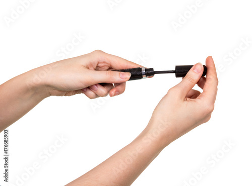 Mascara in female hands isolated on white.