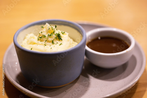 Mashed potatoes in bowl with pepper-cream gravy sauce.