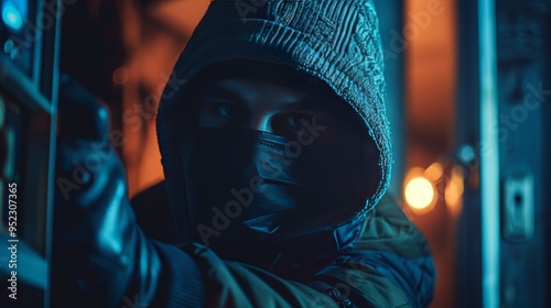 Masked burglar reaching into a safe to take a bill in a shadowy environment