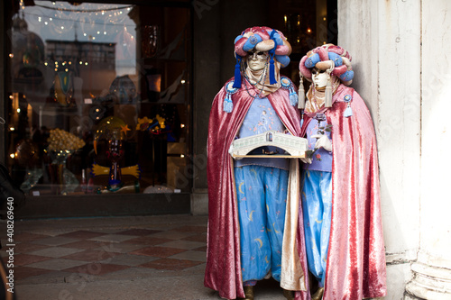 Masked couple in ornate costume at the the Venetian masquerade stands near St. Mark's Square in Venice