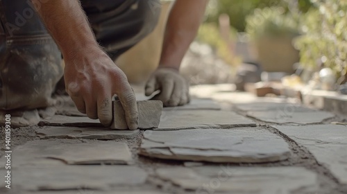 Mason creating a stone foundation for a patio. Featuring technique and accuracy
