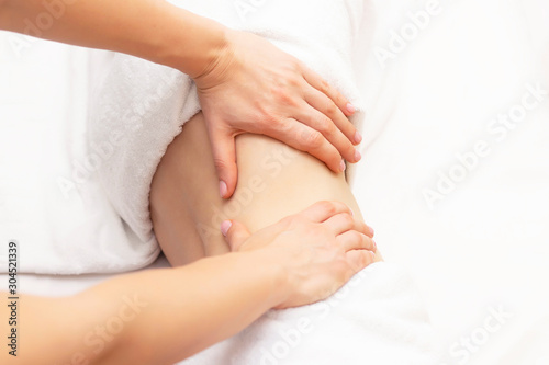 Massage Therapist Massaging a Womens Stomach. Massage and body care. Spa body massage woman hands treatment.