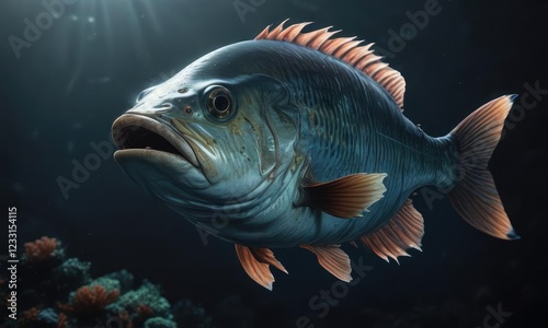 Massive fish with a flat head and large mouth submerged in the dark ocean depths, giant fish, ocean creature