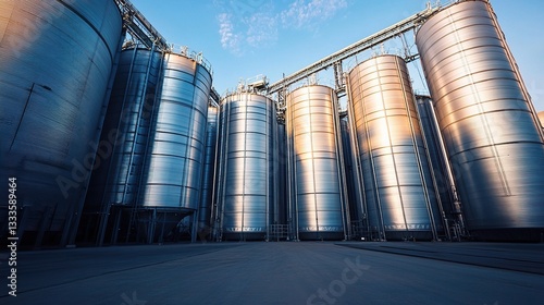 Massive Grain Bins at Modern Processing Plant Against Clear Sky