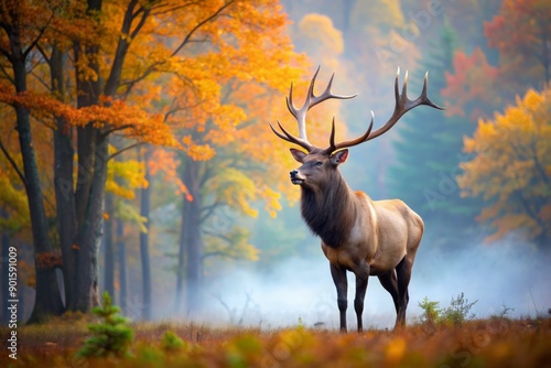 Massive male elk stand tall, antlers poised, in a tense yet tranquil standoff amidst autumn foliage in Pennsylvania's Elk State Forest morning mist.