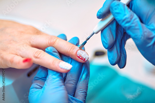 Master applying polish on fingernails on woman