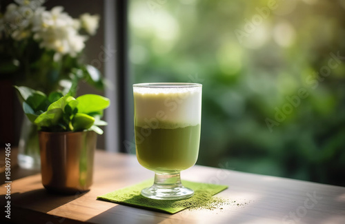 Matcha Delight: A refreshing glass of matcha latte sits on a wooden table, garnished with a sprinkle of matcha powder, beside a miniature potted plant, offering a moment of calm relaxation.