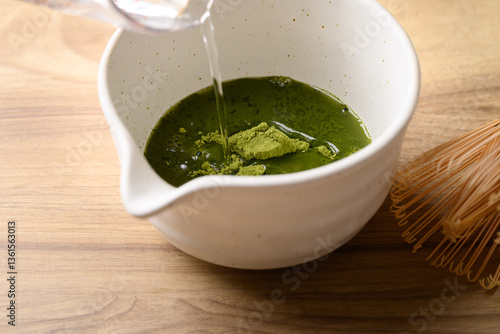 Matcha green tea powder mixing with water in tea bowl