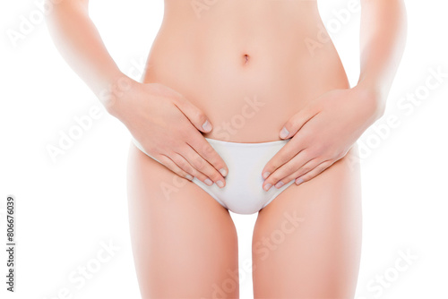 Maternity fertilization disease infertility concept. Cropped close up photo of slim skinny woman's body in white underlinen hands touching gesturing pain in intimate zone isolated on white background