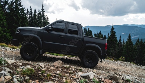 Matte Black Pickup Truck on Rocky Mountain Trail (Side View, Overcast)