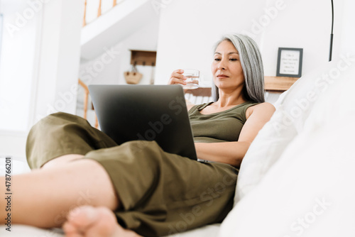 woman, adult, mature, asian, lifestyle, computer, laptop, use, to sit, couch, home, grey, white, morning, indoor, 1, people